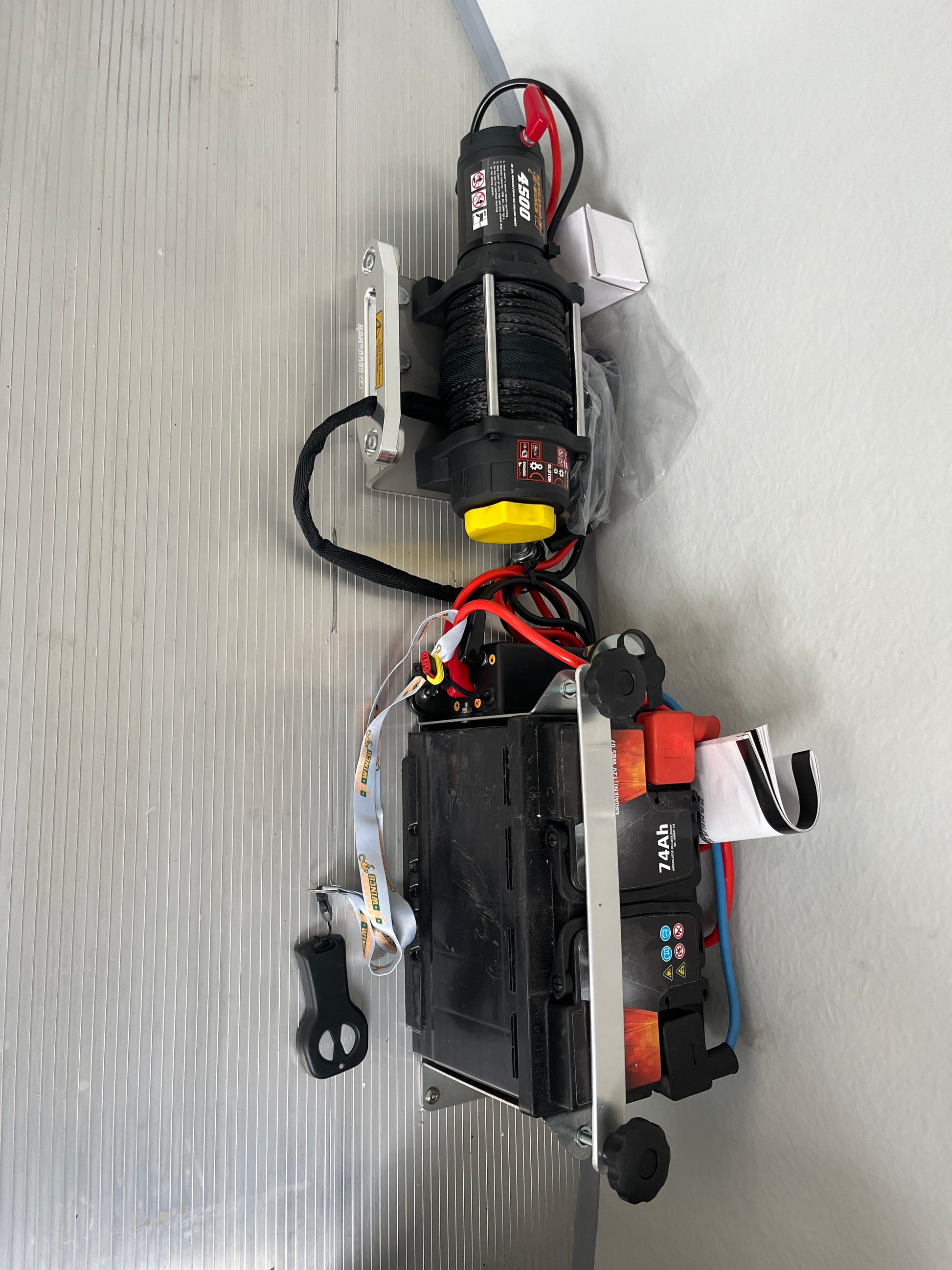 Alt Text: Close-Up of Debon C1000 Electric Winch and Mounted Spare Wheel