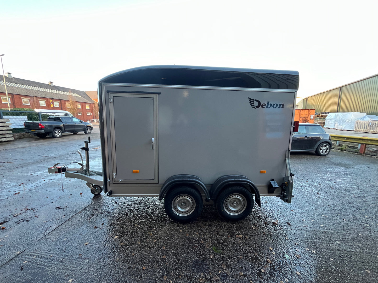 A dual axle box van trailer with a large side opening hatch. The sides are manufactured with composite Sides. The roof and front are in a one-piece polyester. The 2 in 1 ramp/door is in aluminium.